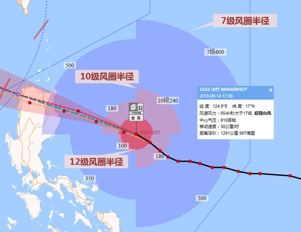 9月14日17時(shí)其位于距我市1291公里的菲律賓以東洋面,中心風(fēng)力17級以上(65米/秒,相當(dāng)于234公里/小時(shí)),中心最低氣壓910百帕,將以30公里/時(shí)的速度向西北方向移動(dòng)。