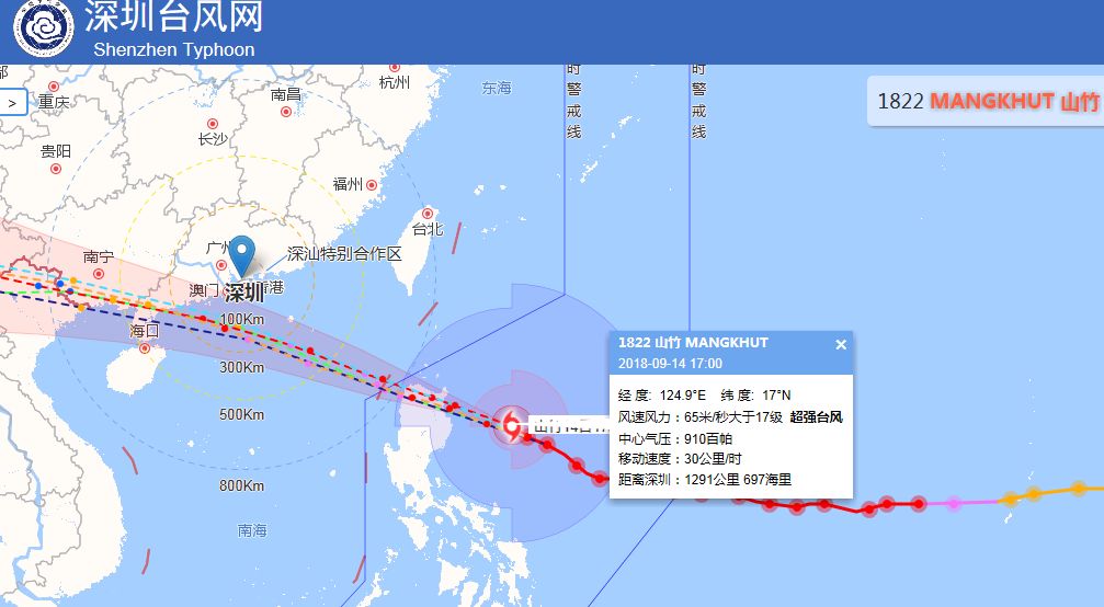 預(yù)計(jì)“山竹”將于14日夜間橫穿菲律賓呂宋島北部山地,15日上午進(jìn)入南海東北部海面,強(qiáng)度減弱,趨向粵西和海南東部沿海,16日夜間在上述地區(qū)以強(qiáng)臺(tái)風(fēng)或超強(qiáng)臺(tái)風(fēng)登陸,16日中午前后距我市最近200-300公里。不排除在陽江至茂名之間登陸、對深圳造成更大風(fēng)雨影響的可能。