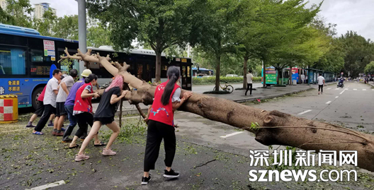 9月16日上午,蛇口街道南水社區(qū)黨委書(shū)記、婦聯(lián)主席李淑文,冒著可能被樹(shù)倒塌木砸傷的危險(xiǎn),浸泡在沒(méi)膝的雨水中幾個(gè)小時(shí)清理臺(tái)風(fēng)刮落路面的樹(shù)枝,讓來(lái)往車輛順利通行。