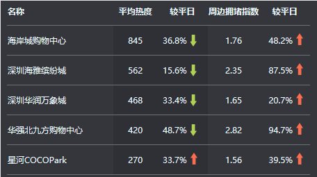 22日12時至今日12時,全市各大型商圈周邊道路交通壓力較平日有所上升,擁堵高峰出現(xiàn)在22日16時至18時,熱門大型商圈周邊道路較為擁堵的有:華強(qiáng)北九方購物中心、深圳海雅繽紛城和海岸城購物中心。