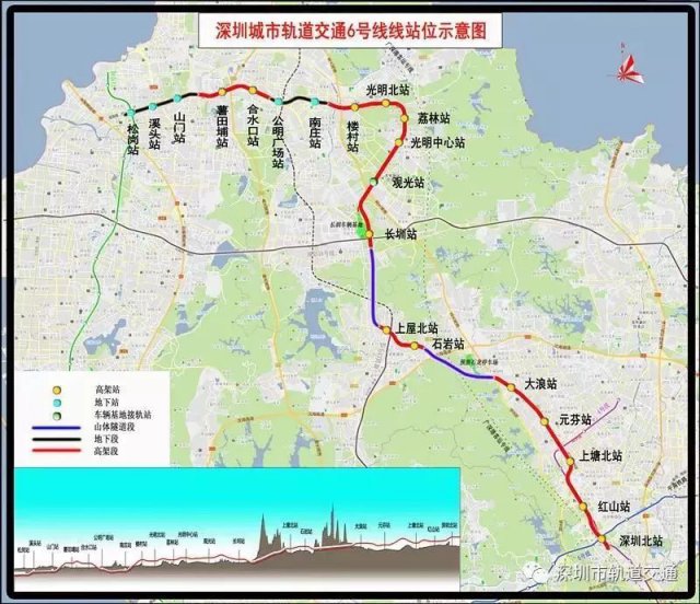 深圳地鐵6號(hào)線全長(zhǎng)約49.4km,其中一期工程長(zhǎng)約37.6km,起自深圳北站綜合交通樞紐,終于松崗站,設(shè)車站20座(其中地下站5座,高架站15座),與4、5、11、13、15號(hào)線及廣深港客運(yùn)專線綜合換乘。
