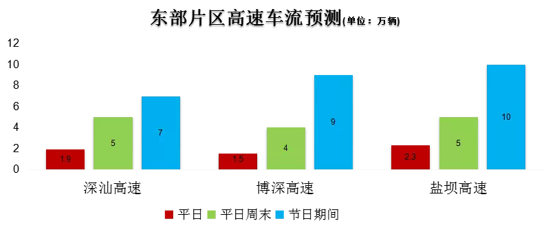 預(yù)計(jì)東部片區(qū)高速在假期后兩天車流增加,從下午至晚上21時(shí)許恢復(fù)正常,尤其是深汕高速和鹽壩高速從每天10時(shí)開始車流增大,并于19時(shí)左右達(dá)到峰值,車流緩行情況將一直持續(xù)到晚上23時(shí)。