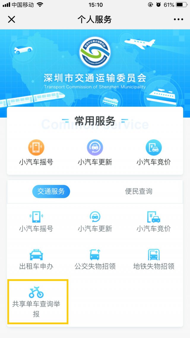 關(guān)注并進入「深圳交委」微信公眾號;點擊「便民服務(wù)」菜單欄 &;在「交通服務(wù)」分類下就可以找到「共享單車查詢舉報」功能了!
