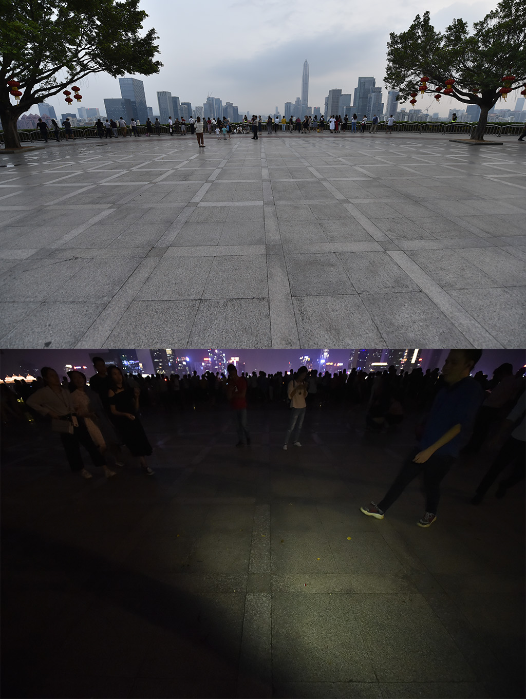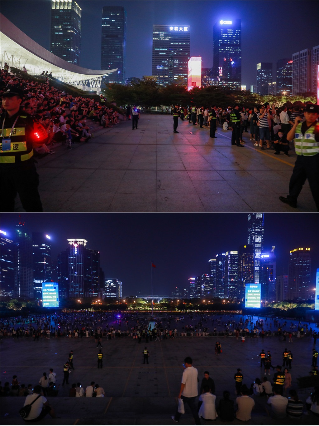 10月8日晚,蓮花山觀景臺的看燈人潮并沒有燈光秀首秀那一天洶涌,燈光表演過后,只有兩名清潔工人留下來進行垃圾清掃?!敖裢砝佟!必撠熒徎ㄉ接^景臺區(qū)域的環(huán)衛(wèi)工人告訴記者,“我們在燈光秀期間看到垃圾就會及時清理,一般散場之后一個小時是清掃時間,但今天這個工作很快就完成了,深圳人素質(zhì)還是很高的,基本很少有人會亂丟垃圾?!?/p>