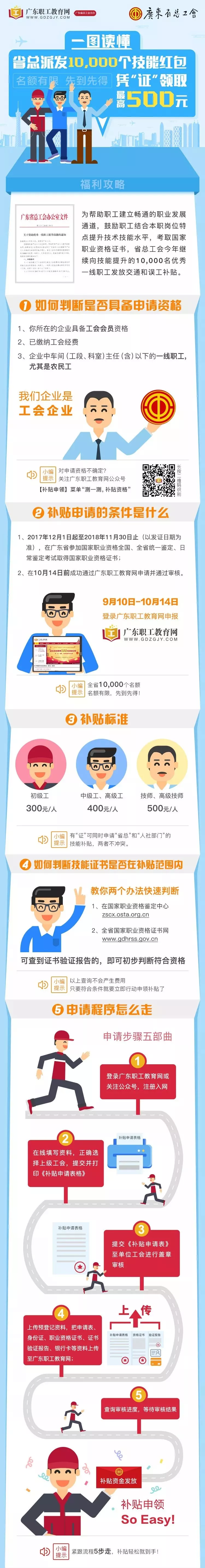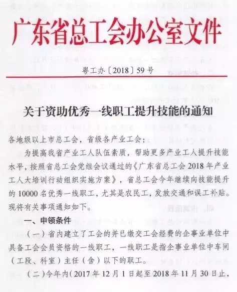 為提高我省產(chǎn)業(yè)工人隊(duì)伍素質(zhì),幫助更多產(chǎn)業(yè)工人提升技能水平,按照省總工會(huì)黨組會(huì)議通過(guò)的《廣東省總工會(huì)2018年產(chǎn)業(yè)工人大培訓(xùn)行動(dòng)組織實(shí)施方案》,省總工會(huì)繼續(xù)向10000名技能提升的優(yōu)秀產(chǎn)業(yè)工人發(fā)放交通和誤工補(bǔ)貼。取得職業(yè)資格證書可獲300~500元補(bǔ)貼,名額有限,先到先得!