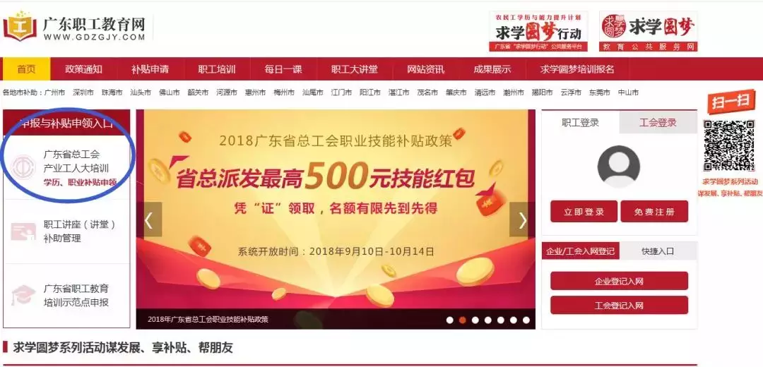 在網(wǎng)站(www.gdzgjy.com)首頁左側(cè)【申報(bào)與補(bǔ)貼申領(lǐng)入口】,點(diǎn)擊“廣東省總工會(huì)產(chǎn)業(yè)工人大培訓(xùn)學(xué)歷、職業(yè)補(bǔ)貼申領(lǐng)”界面,選擇右側(cè)“職業(yè)技能提升補(bǔ)助”點(diǎn)擊【進(jìn)入申領(lǐng)】。