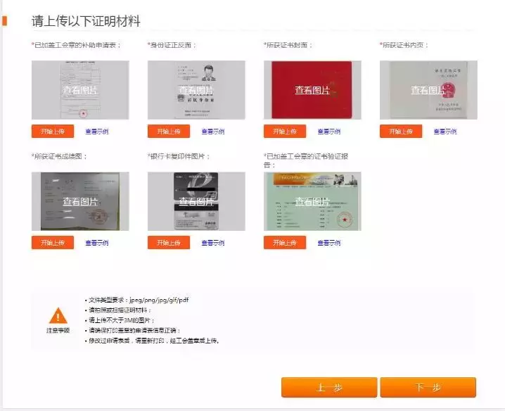 3.進(jìn)入證明資料上傳頁(yè)面,將準(zhǔn)備好的資料進(jìn)行上傳,全部上傳完后,點(diǎn)擊【下一步完成提交】;