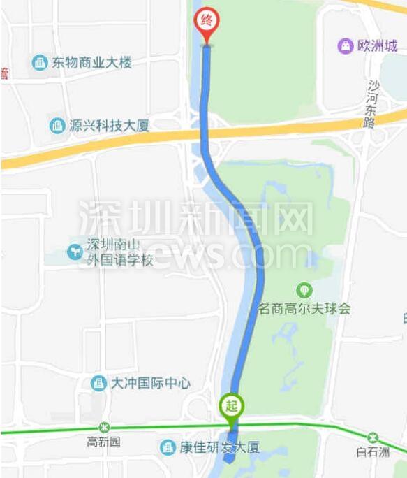 該網(wǎng)友在帖文中稱,聽聞濱海沙河西立交橋下到深南沙河西天橋的騎行路段今年9月份開通了,于是他周末帶著孩子沿沙河?xùn)|側(cè)騎行,準(zhǔn)備一睹深圳最美騎行路段的風(fēng)景。由于周末限騎行原則,該網(wǎng)友被迫輾轉(zhuǎn)數(shù)次才到達(dá)大沙河公園。具體騎行路程如下: