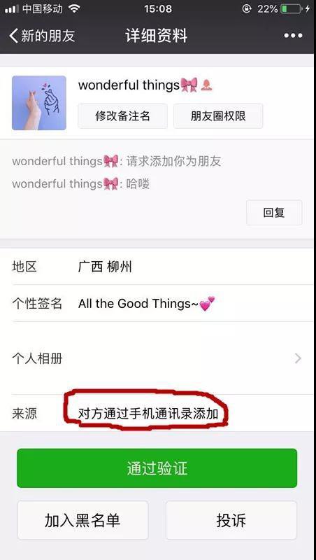 或者 " 通過手機通訊錄 " 添加的申請,實際上是騙子使用一種軟件,把經(jīng)地下渠道收集到的眾多手機號碼自動存入自己的手機通訊錄,然后由微信自動匹配發(fā)出好友申請,迷惑性極強。
