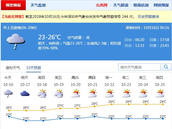 深圳市氣象局提醒,16日 ~17日陰天有雨,雨天路面濕滑能見(jiàn)度差,對(duì)交通影響較大,需注意防范降雨對(duì)上班高峰期帶來(lái)的不利影響。預(yù)計(jì)17日重陽(yáng)節(jié)早晨仍有分散小雨,路面濕滑,戶外登高要注意防滑保暖。