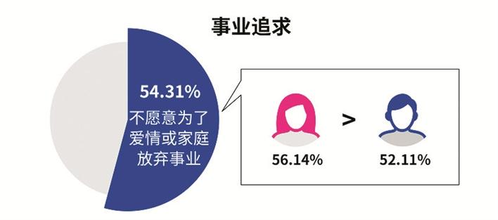 對于許多人而言,愛情和事業(yè)沖突的抉擇已經(jīng)越來越常見。調(diào)查顯示,54.31%的單身男女不愿意為了愛情或家庭放棄自己的事業(yè)。從男女差異看,56.14%的女性表示不愿意為了愛情或家庭放棄自己的職場或事業(yè),高于男性。可見,女性對于事業(yè)的追求正在逐漸提升。