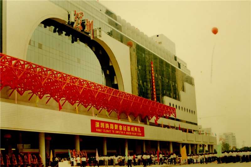 1991年10月12日,深圳新客站落成。時(shí)任國(guó)務(wù)院副總理田紀(jì)云出席典禮并剪彩。圖為典禮盛況