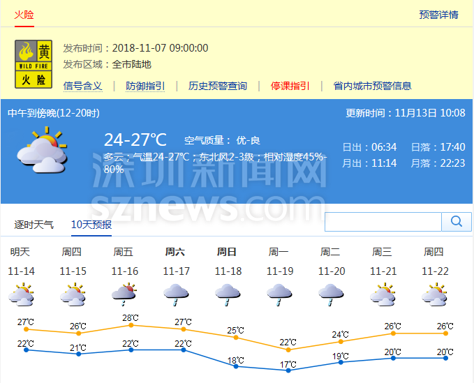 氣象局提醒市民,深圳市日間天氣干燥,火險(xiǎn)預(yù)警信號生效中,請?jiān)趹敉獾淖⒁夥阑稹?/p>