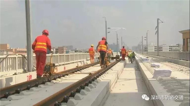 從施工現(xiàn)場可以看到,鋪軌機把長軌放入無碴道床就位,當鋼軌最后精準就位后,要求正負誤差不超過1毫米。目前鋪軌進度至少每天7公里,11日上午從金沙站開始不停歇作業(yè),到下午兩點鋪軌作業(yè)已臨近深圳。項目建設(shè)者表示,大約本月20號鋪設(shè)到深圳機場北站。