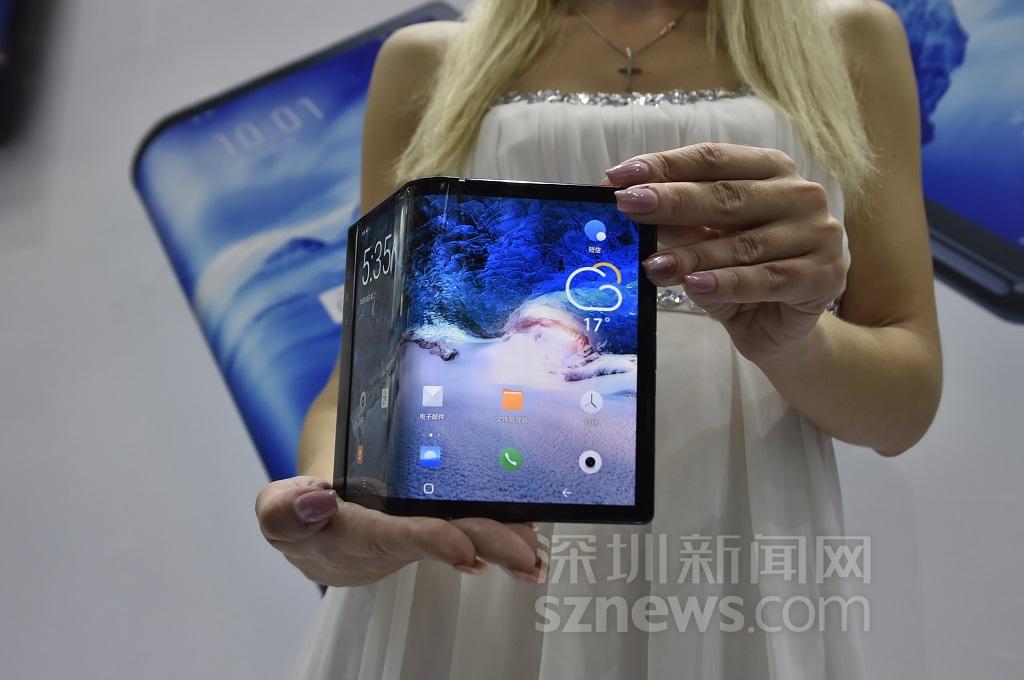 模特展示全球首款可折疊柔性屏手機(jī)柔派