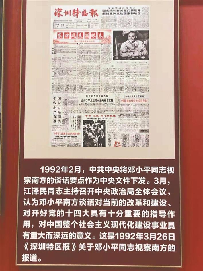 ▲展覽展出的1992年3月26日刊登長篇通訊《東方風來滿眼春》的《深圳特區(qū)報》頭版圖片。