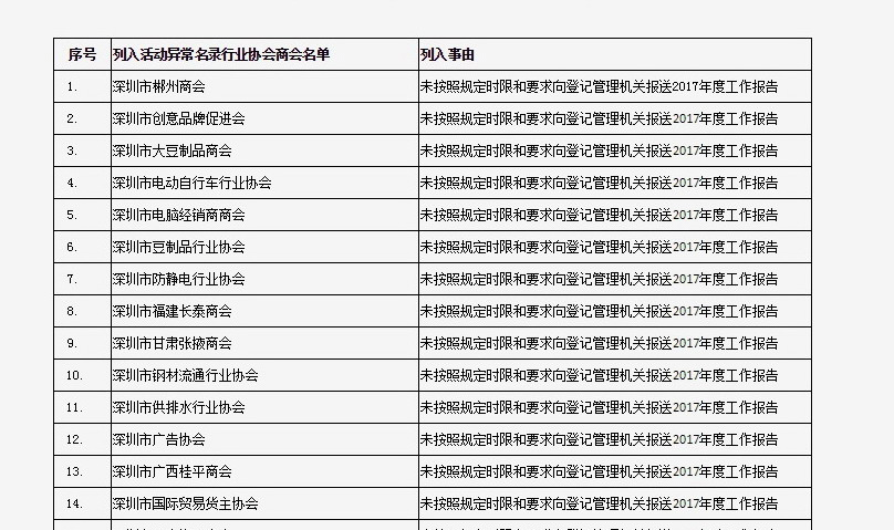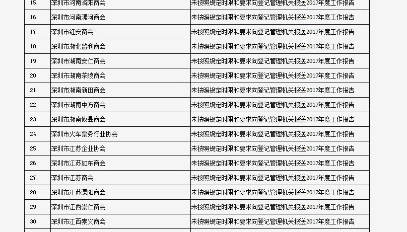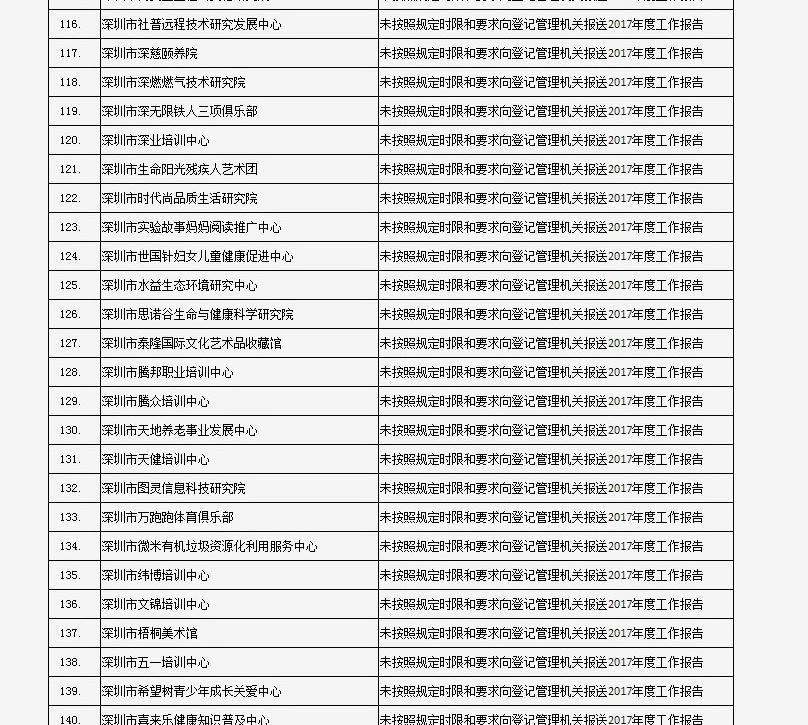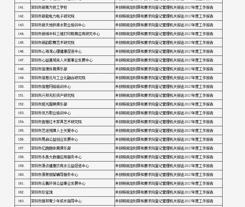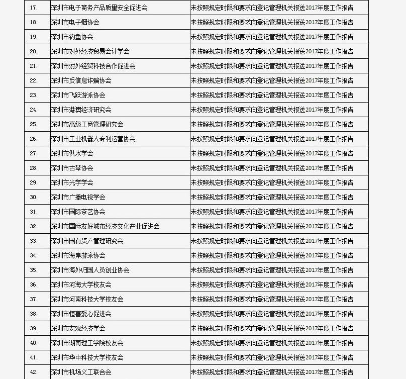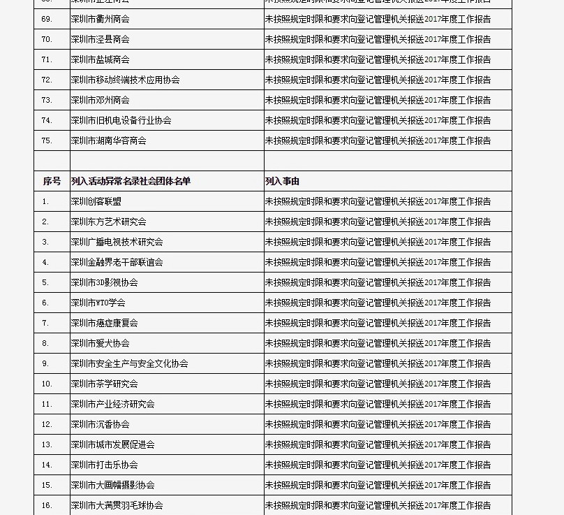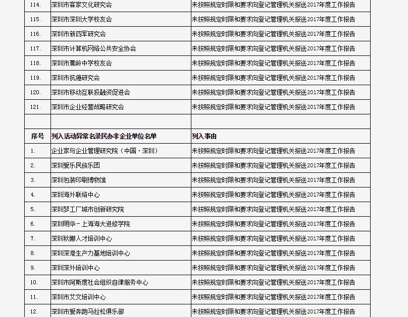 據(jù)深圳市民政局通報,深圳市華中科技大學校友會和深圳市深圳大學校友會等121家社會團體、深圳市郴州商會等75家行業(yè)協(xié)會商會、企業(yè)家與企業(yè)管理研究院(中國·深圳)等201家民辦非企業(yè)單位、深圳市明園慈善基金會等20家基金會,經(jīng)查“未按照規(guī)定時限和要求向登記管理機關報送2017年度工作報告”,違反了《社會組織信用信息管理辦法》《深圳經(jīng)濟特區(qū)行業(yè)協(xié)會條例》的相關規(guī)定,被列入活動異常名錄名單。完整版名單已在“深圳民政在線”公布。