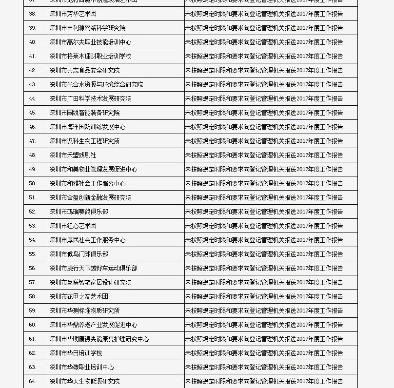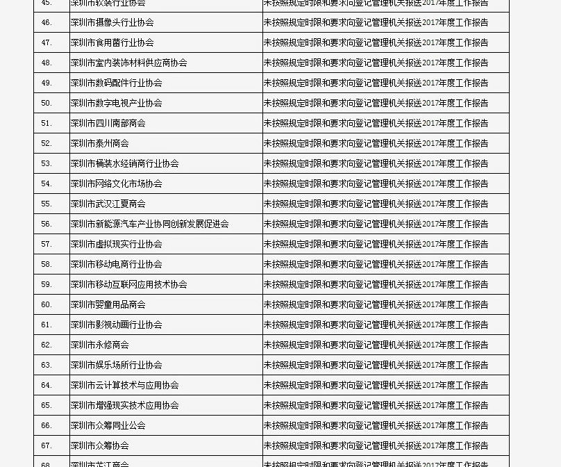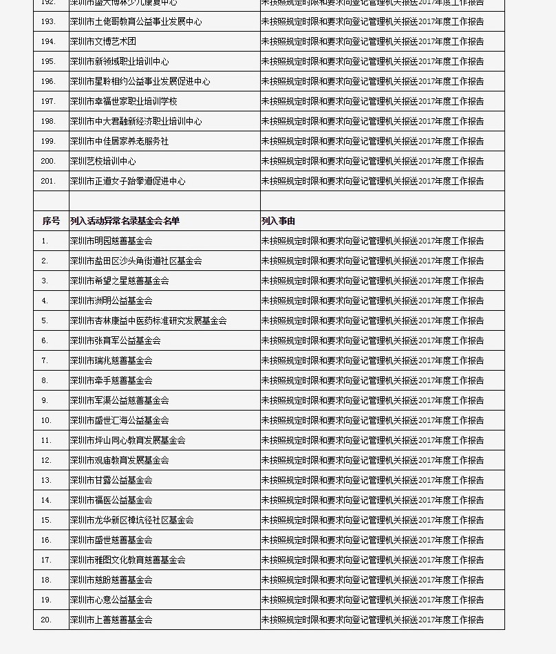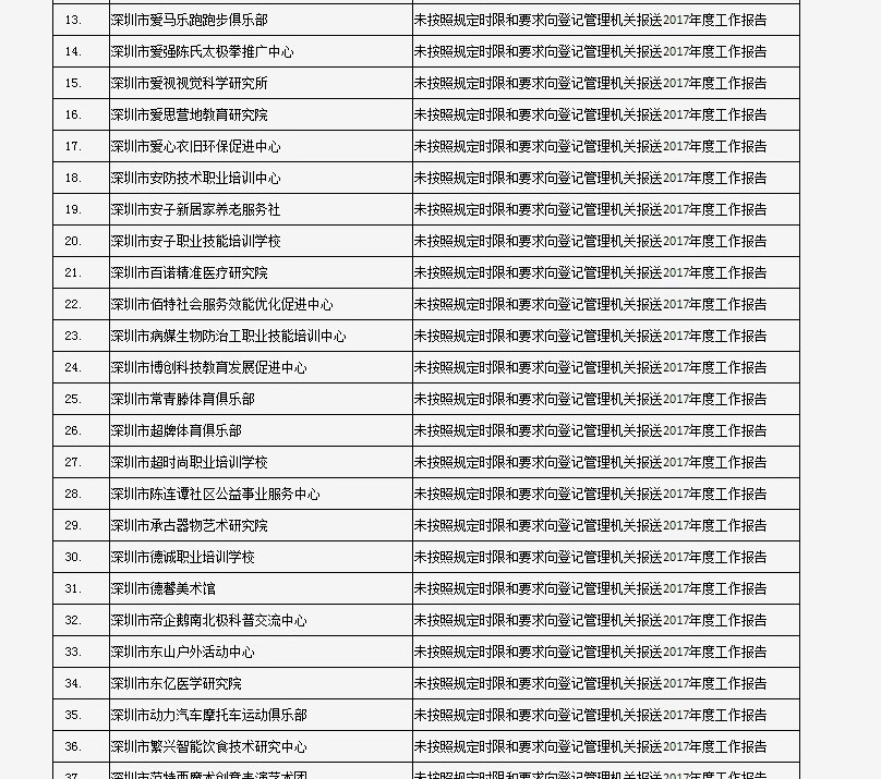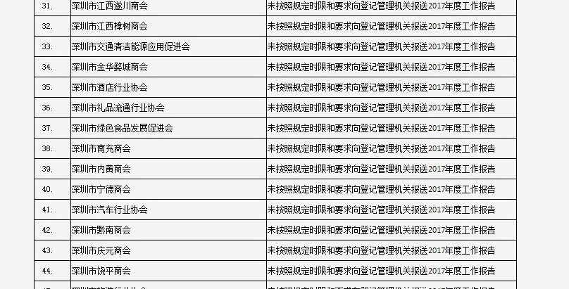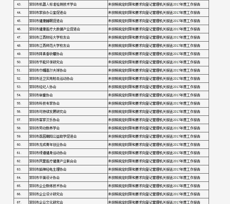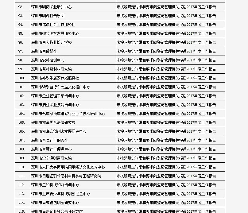 據(jù)深圳市民政局通報,深圳市華中科技大學校友會和深圳市深圳大學校友會等121家社會團體、深圳市郴州商會等75家行業(yè)協(xié)會商會、企業(yè)家與企業(yè)管理研究院(中國·深圳)等201家民辦非企業(yè)單位、深圳市明園慈善基金會等20家基金會,經(jīng)查“未按照規(guī)定時限和要求向登記管理機關報送2017年度工作報告”,違反了《社會組織信用信息管理辦法》《深圳經(jīng)濟特區(qū)行業(yè)協(xié)會條例》的相關規(guī)定,被列入活動異常名錄名單。完整版名單已在“深圳民政在線”公布。