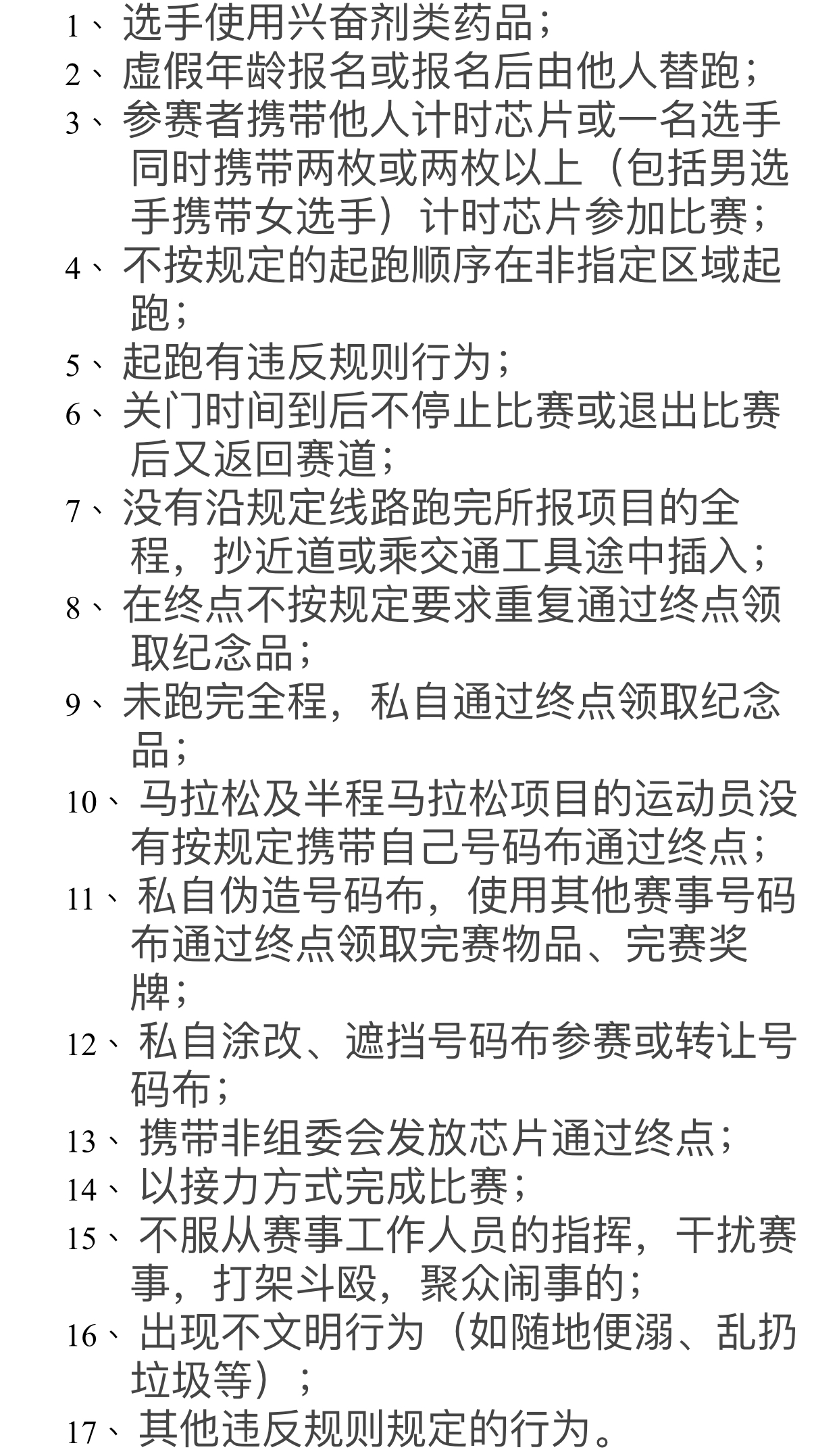 據(jù)悉,在比賽期間選手出現(xiàn)17項(xiàng)違規(guī)行為之一的問題,裁判員有權(quán)中止選手的比賽并當(dāng)場沒收違規(guī)選手的號(hào)碼布及芯片,取消其比賽資格,賽后由組委會(huì)視情節(jié)輕重分別給予參賽選手取消2018深馬比賽成績、禁賽1至2年,情節(jié)嚴(yán)重者終身禁賽等處罰,并將違規(guī)信息報(bào)送中國田協(xié)申請系列追加處罰。