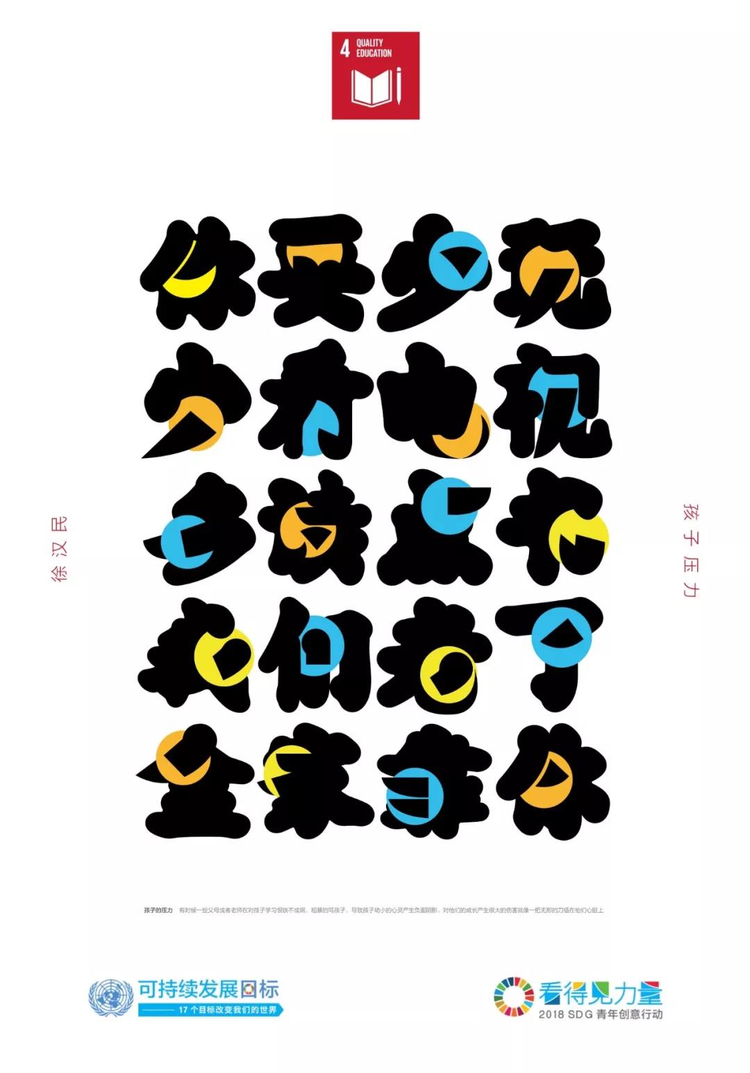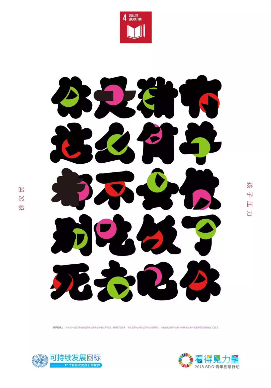 作品解釋 /現(xiàn)在孩子的壓力越來(lái)越大,導(dǎo)致很多孩子心理灰暗、暴力犯罪、自我封閉等現(xiàn)象,其中一個(gè)原因是父母期望和恨鐵不成鋼打罵給孩子帶來(lái)沉重的壓力。由此作者直接用那些語(yǔ)句來(lái)設(shè)計(jì),這些字體中穿插著一個(gè)小圓點(diǎn)即孩子們的腦袋,他們被這些語(yǔ)言帶來(lái)的無(wú)形壓力刺痛,整個(gè)字比較圓潤(rùn)只有關(guān)鍵的地方鋒利無(wú)比,就像一把無(wú)形的刀插在他們心上。