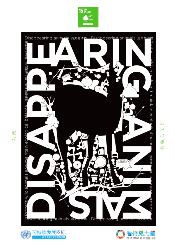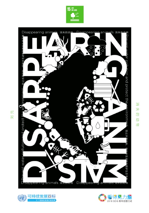 作品解釋 /隨著工業(yè)社會的飛速發(fā)展,我們面對的環(huán)境問題越來越嚴(yán)重,特別是人類的伙伴-動物更是面臨著各種環(huán)境問題在不斷減少,作品以Disappearing animals為主題結(jié)合水、陸、空三種類型動物為代表,以生活垃圾、破壞及殺害動物等各種因素為設(shè)計(jì)元素,巧妙結(jié)合為正負(fù)圖形概念來傳達(dá)海報(bào)主題,黑白視覺、傳達(dá)危機(jī)。