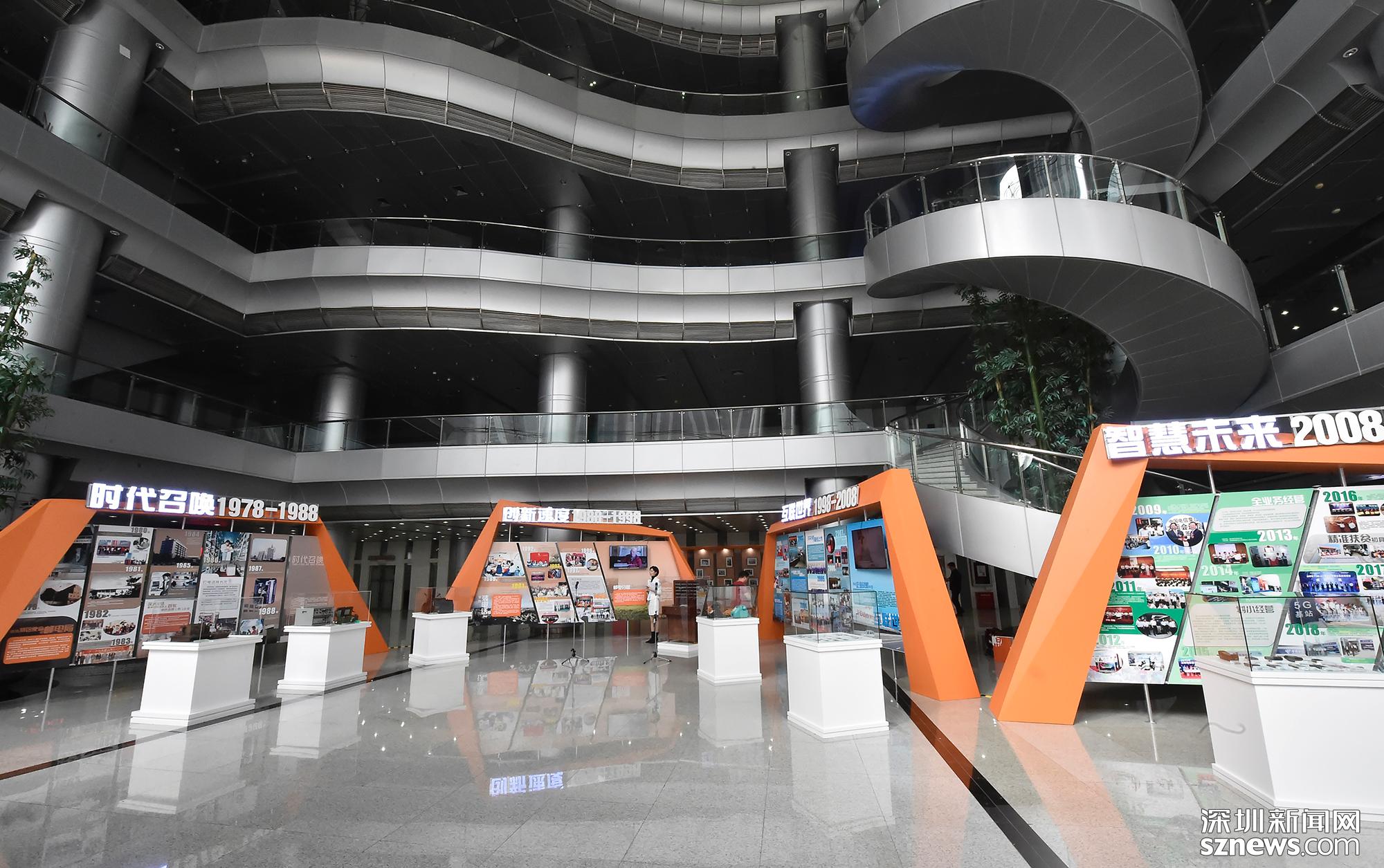 深圳通信改革開放40周年展覽在信息樞紐中心開展,圖為展覽全景圖