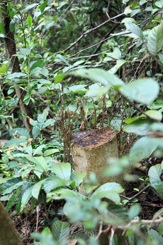 12月24日上午,記者再次來到首次發(fā)現(xiàn)盜采土沉香的地點(diǎn)。經(jīng)過近兩個小時的搜尋,在東北側(cè)山坡和溪谷中,又接連發(fā)現(xiàn)了6棵被盜伐的疑似野生土沉香。記者隨即將情況向仙湖植物園管理處副主任、植物專家張壽洲博士通報了情況,張博士告訴記者,管理處會盡快勘查現(xiàn)場,對被破壞的土沉香進(jìn)行處理。"通常情況下,被鋸斷的土沉香不會死亡,我們會根據(jù)實(shí)際情況對受損的植株采取相應(yīng)的保護(hù)措施。另外,我們會用水泥、油漆對土沉香被盜采盜伐的斷面進(jìn)行封閉處理,讓不法分子盜采不到香料。"張博士說。
