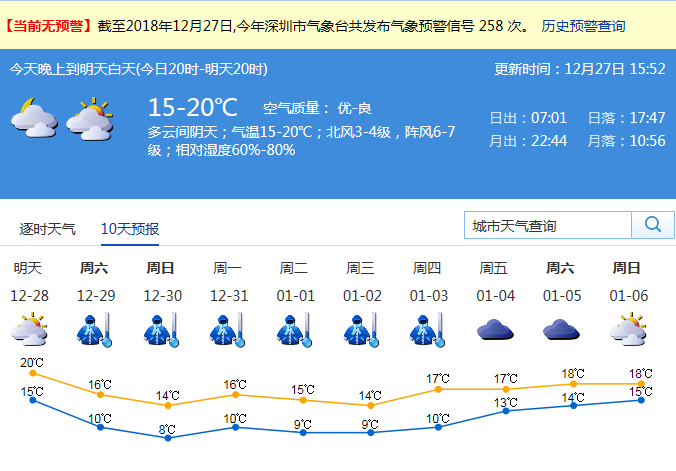 記者從深圳市氣象局了解到,27日晚上到28日白天(今日20時(shí)-明天20時(shí))氣溫在15-20℃,空氣質(zhì)量優(yōu)-良,深圳市以多云間陰為主天;北風(fēng)3-4級(jí),陣風(fēng)6-7級(jí);相對(duì)濕度60%-80%。