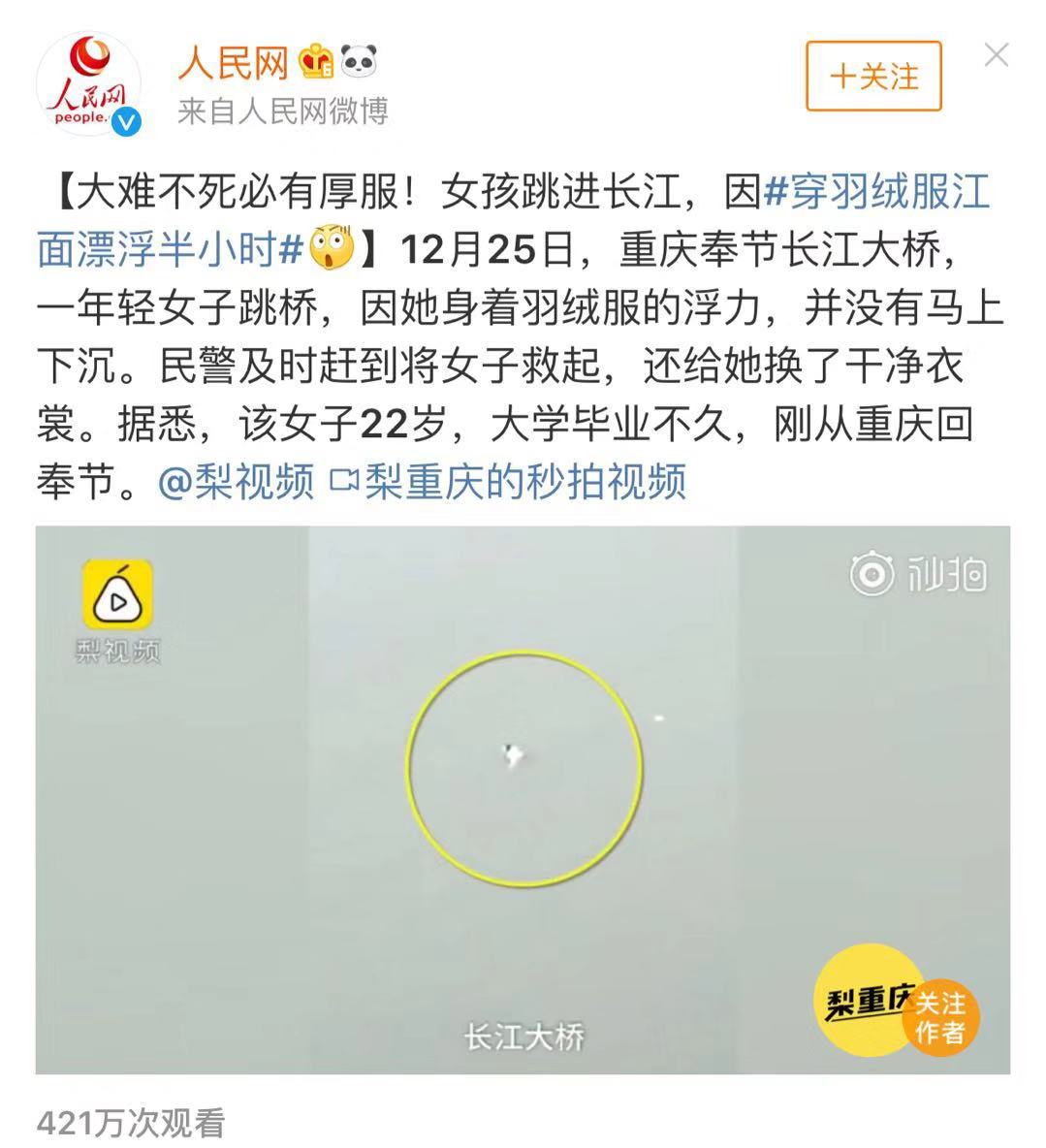 重慶有個22歲的姑娘跳長江尋短見,因身上羽絨服的浮力在江上漂浮了近半小時(shí)