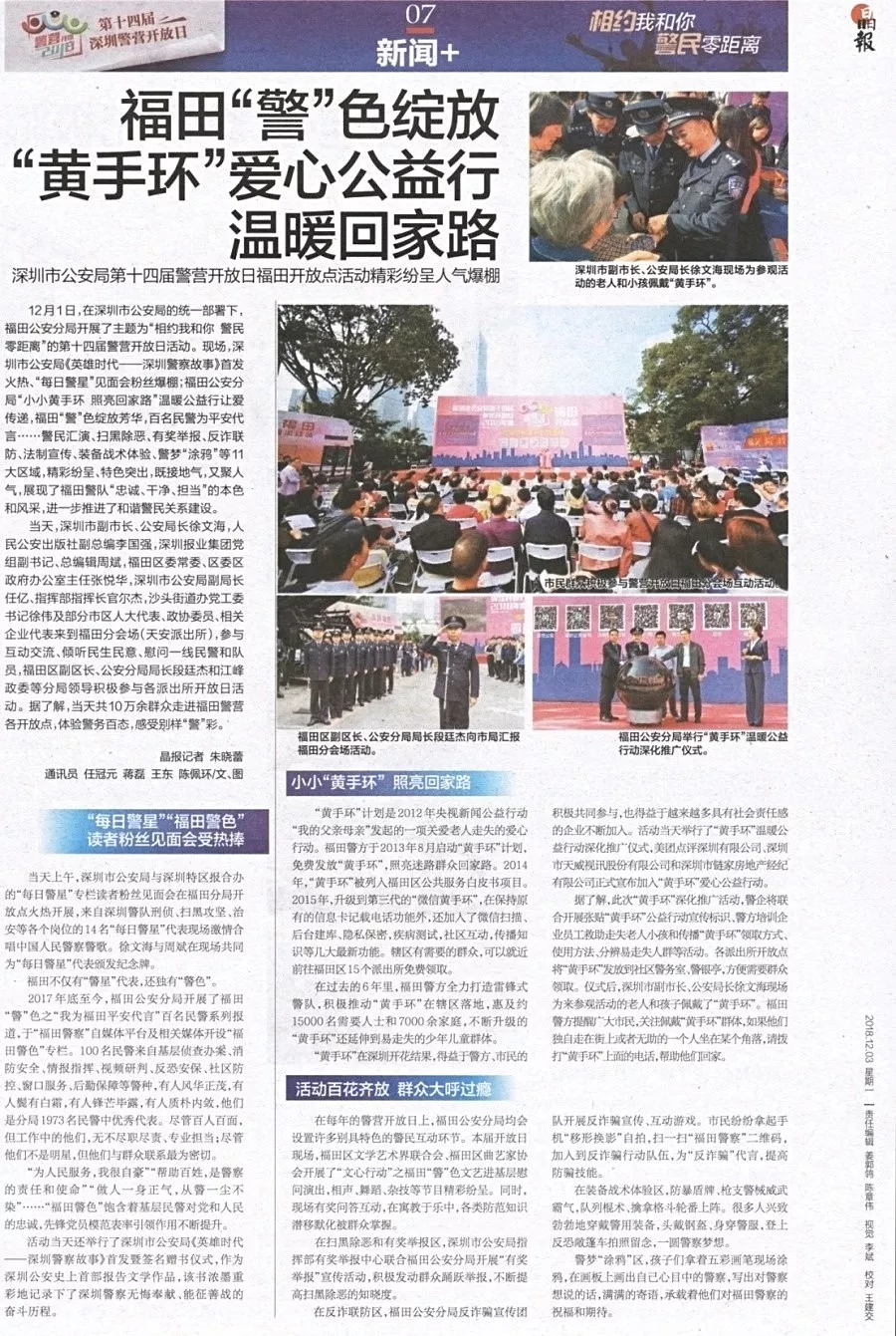 ★★12月1日,在深圳市公安局的統(tǒng)一部署下,福田公安分局開展了主題為“相約我和你警民零距離”的第十四屆警營開放日活動(dòng)?,F(xiàn)場(chǎng),深圳市公安局《英雄時(shí)代——深圳警察故事》首發(fā)火熱、“每日警星”見面會(huì)粉絲爆棚;福田公安分局“小小黃手環(huán)照亮回家路”溫暖公益行讓愛傳遞,福田“警”色綻放芳華、百名民警為平安代言……警民匯演、掃黑除惡、有獎(jiǎng)舉報(bào)、反詐聯(lián)防、法制宣傳、裝備戰(zhàn)術(shù)體驗(yàn)、警夢(mèng)涂鴉等11大區(qū)域,精彩紛呈、特色突出,進(jìn)一步推進(jìn)了和諧警民關(guān)系建設(shè)。