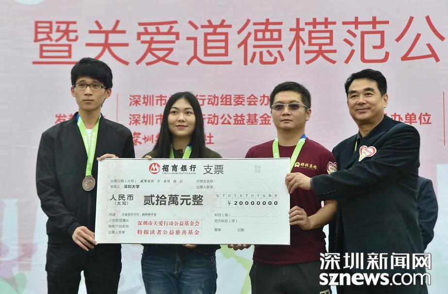 值得一提的是,在活動(dòng)現(xiàn)場(chǎng)還舉行了“公益金百萬行”助學(xué)金捐贈(zèng)儀式,為深圳大學(xué)、深圳職業(yè)技術(shù)學(xué)院、深圳信息學(xué)院三所高校各捐贈(zèng)了20萬元,用于資助這三所學(xué)校的困難學(xué)子。迄今深圳特區(qū)報(bào)讀者公益慈善基金已資助1613名貧困大學(xué)生,累計(jì)資助金額達(dá)409萬元。