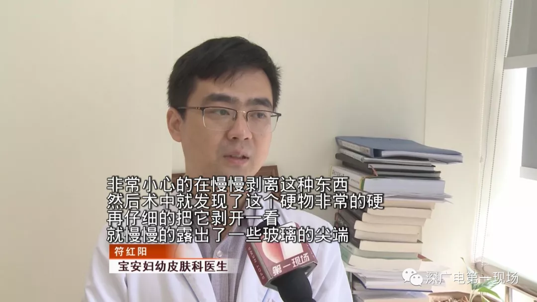 從曾女士的左側下眼瞼中取出的,正是這個長度接近一厘米的玻璃碎塊。