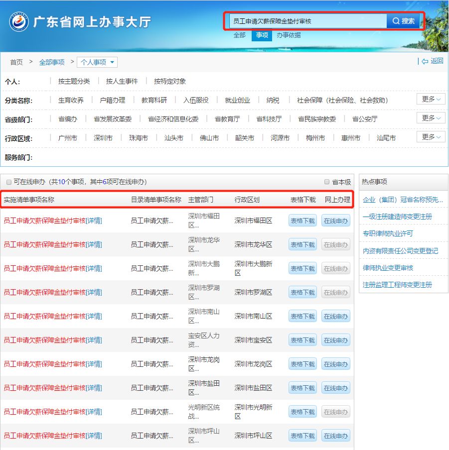答:員工登錄廣東省網(wǎng)上辦事大廳官網(wǎng),點擊“個人事項”,在搜索欄中輸入“員工申請欠薪保障金墊付審核”,可查詢到各區(qū)“員工申請欠薪保障金墊付審核”事項,選擇所在區(qū)點擊“詳情”,即可查詢到所在區(qū)人力資源部門的咨詢電話、辦理地址、辦理時間和交通指引等相關信息。