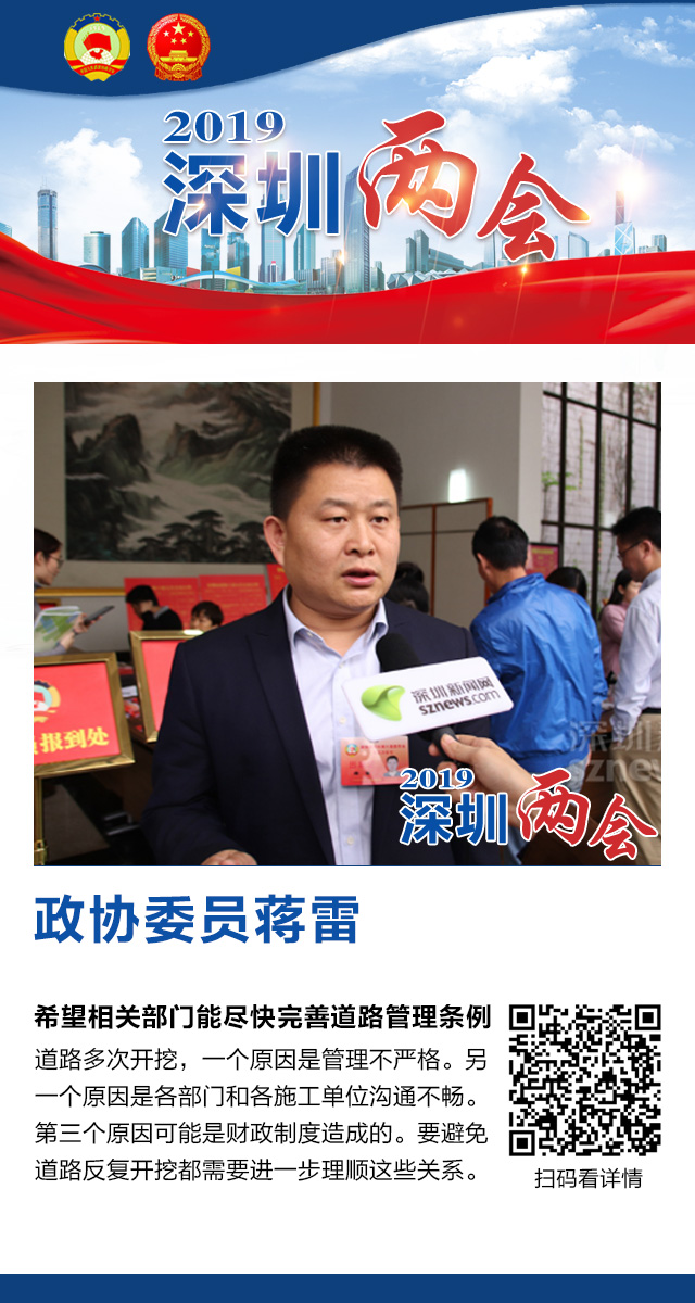 深圳新聞網(wǎng)2019年1月17日訊 深圳市政協(xié)六屆五次會議1月16日開幕,記者就全市范圍內(nèi)出現(xiàn)的道路反復(fù)開挖向政協(xié)委員們征求解決良方,委員們表示,在(道路反復(fù)開挖)這件事情上,我們每個人都是受害者。只有各部門一盤棋,讓規(guī)劃更有前瞻性,讓城市建設(shè)慢下來,才能解決問題,減少給市民生活帶來的各種不便。下面讓我們一起來看看委員們的觀點。