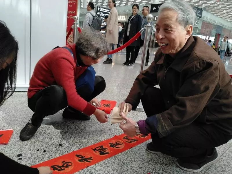 來(lái)領(lǐng)春聯(lián)的旅客里有國(guó)內(nèi)輾轉(zhuǎn)回老家的,有回國(guó)過(guò)年的,也有特地去國(guó)外過(guò)年的。來(lái)自江西婺源的曾老先生11點(diǎn)多的飛機(jī)飛往馬來(lái)西亞,今年他和老伴、孩子將在馬來(lái)西亞過(guò)年。他選的這兩幅春聯(lián)是他對(duì)新年的希望與祝福,將帶到馬來(lái)西亞貼起來(lái),給新年增添年味兒?!拔疫€可以送給朋友,這是最好的禮物,他們一定會(huì)喜歡的?!痹壬吲d地說(shuō)。