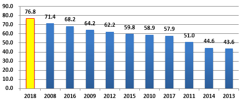 根據(jù)全市區(qū)域自動氣象站臺風(fēng)風(fēng)雨影響綜合年景指數(shù)計(jì)算結(jié)果,2018年臺風(fēng)風(fēng)雨影響綜合年景指數(shù)達(dá)到76.8,成為2008年以來最嚴(yán)重的一年,超過2008年的71.4。