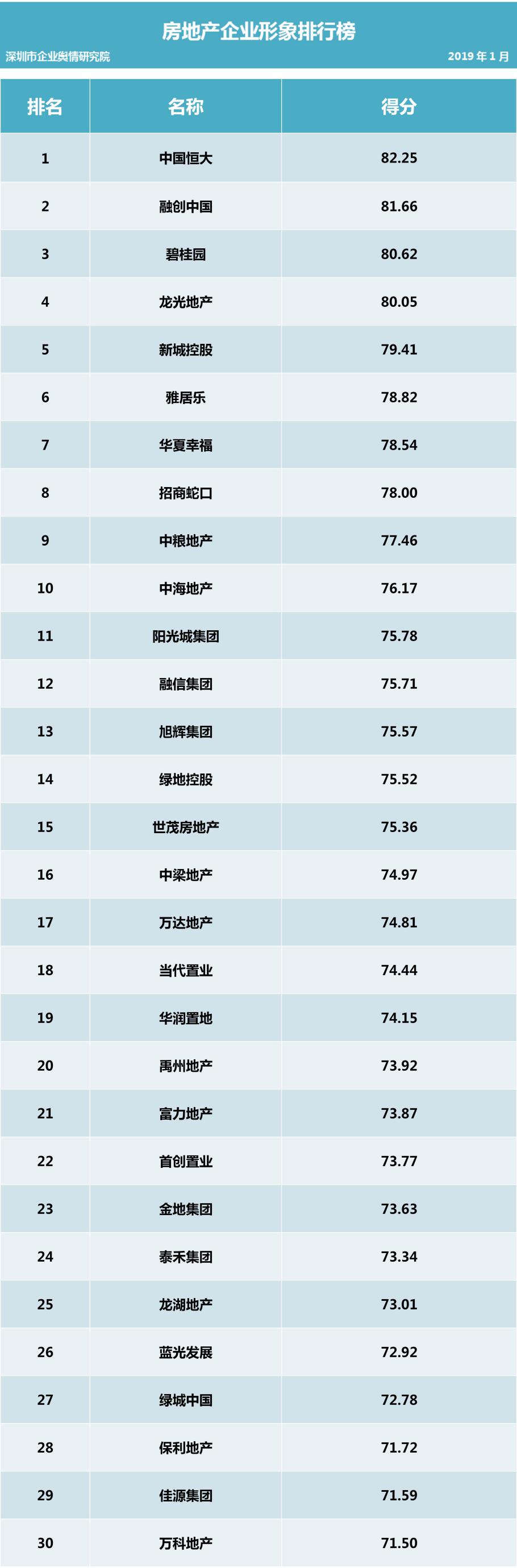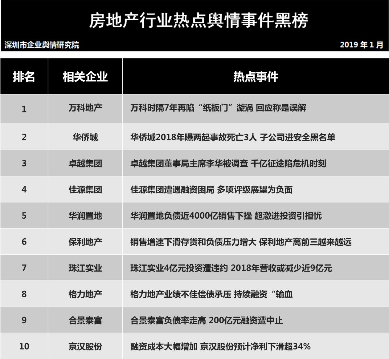 深圳新聞網(wǎng)2019年1月31日訊 (記者田志強(qiáng) 通訊員陳文光)1月31日,深圳企業(yè)輿情研究院發(fā)布第十二批企業(yè)輿情榜單。本次榜單重點(diǎn)聚焦房地產(chǎn)及醫(yī)藥保健兩個(gè)行業(yè)。房地產(chǎn)行業(yè)企業(yè)輿情榜單由房地產(chǎn)行業(yè)熱點(diǎn)輿情事件排行榜(紅、黑榜)及房地產(chǎn)企業(yè)公眾形象排行榜組成。