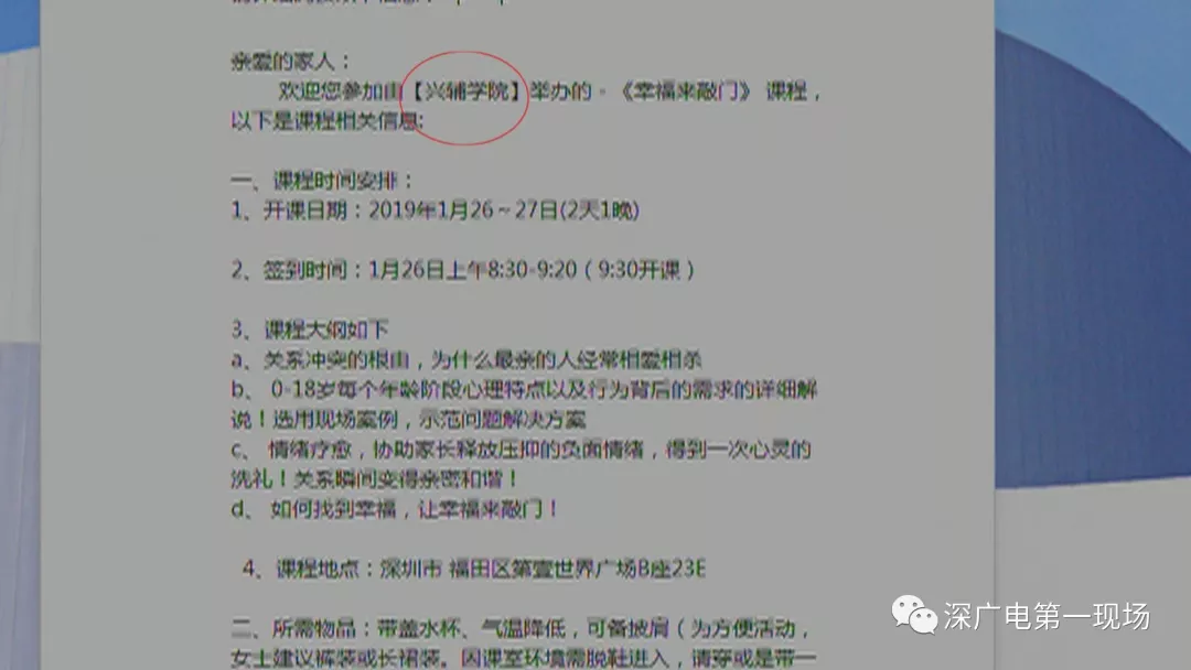 深廣電第一現(xiàn)場2019年2月1日訊 寒假前夕,龍華區(qū)不少家長向我們欄目反映,從上學期開始他們通過學校老師的介紹,接觸到了一個教育機構(gòu)。這個校外的培訓機構(gòu),主要給家長傳授親子教育和家庭相處的技巧,按說這應該是一件好事,可是一些家長卻發(fā)現(xiàn),參加了一些課程之后,不光家庭關(guān)系沒有變好,反而帶來了不少家庭矛盾?