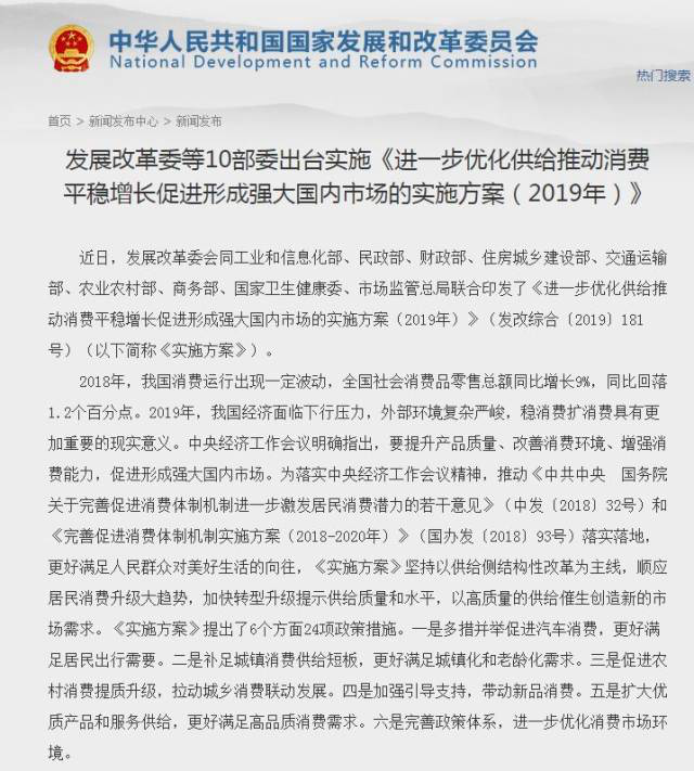 1月29日,“看不過去”的發(fā)改委就印發(fā)了《進(jìn)一步優(yōu)化供給推動(dòng)消費(fèi)平穩(wěn)增長(zhǎng)促進(jìn)形成強(qiáng)大國內(nèi)市場(chǎng)的實(shí)施方案(2019年)》