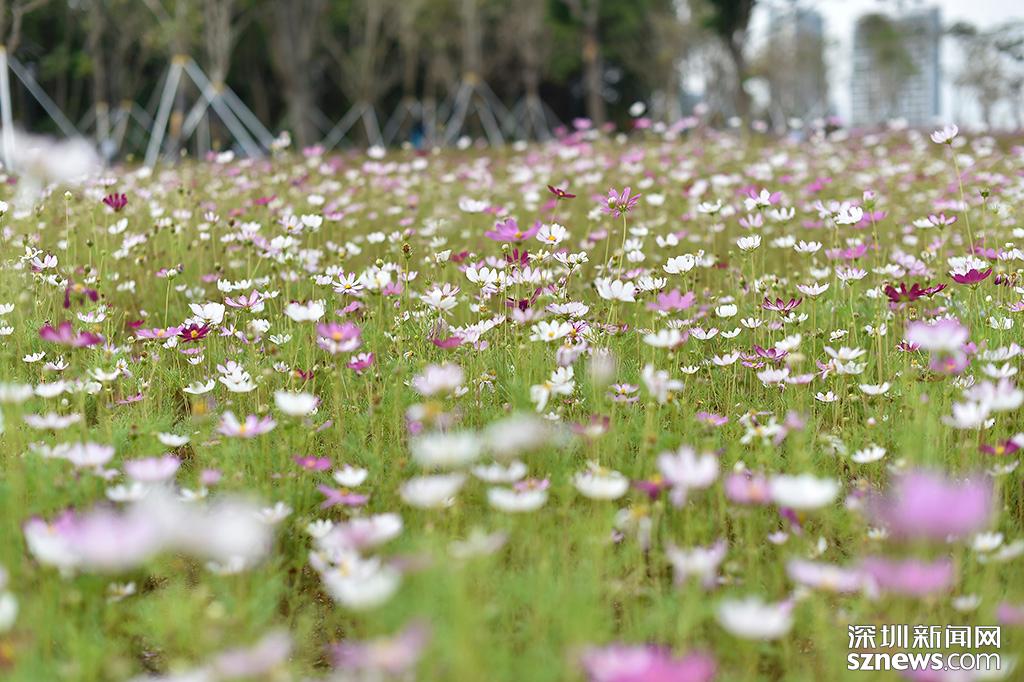 成片的波斯菊融入春色之間