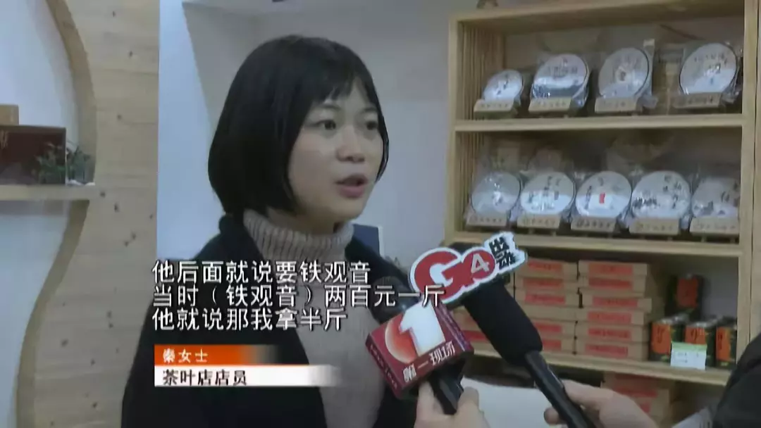 秦女士介紹,26日下午5點鐘左右,她和另一位店員正在包裝茶葉。正當兩人忙活的時候,一位目測有40多歲的顧客突然進店,說想要買點茶葉。秦女士回憶,那個人一進來就問了有沒有一百塊的茶葉,她說沒有,然后這位顧客就問最便宜的茶是哪一種,最后說要買鐵觀音,而鐵觀音是200塊一斤,顧客表示要半斤。