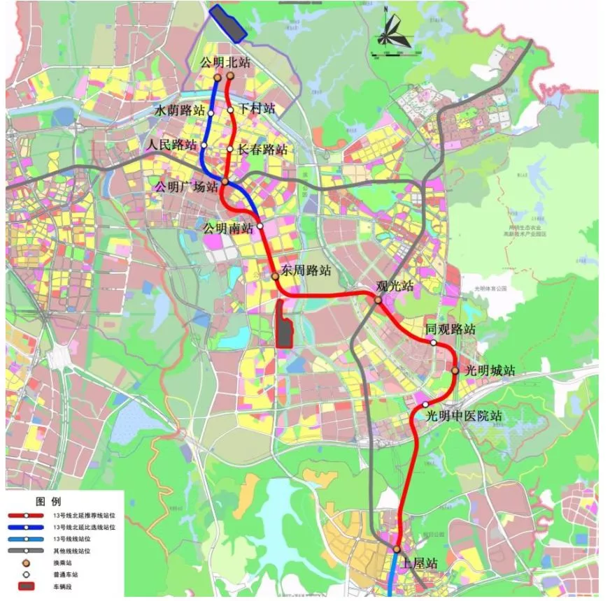 13號線北延線位于深圳市光明區(qū)境內(nèi),整個(gè)線路總體呈南北走向,終止于公明北站。線路全長約19.2公里,采用地下敷設(shè)。
