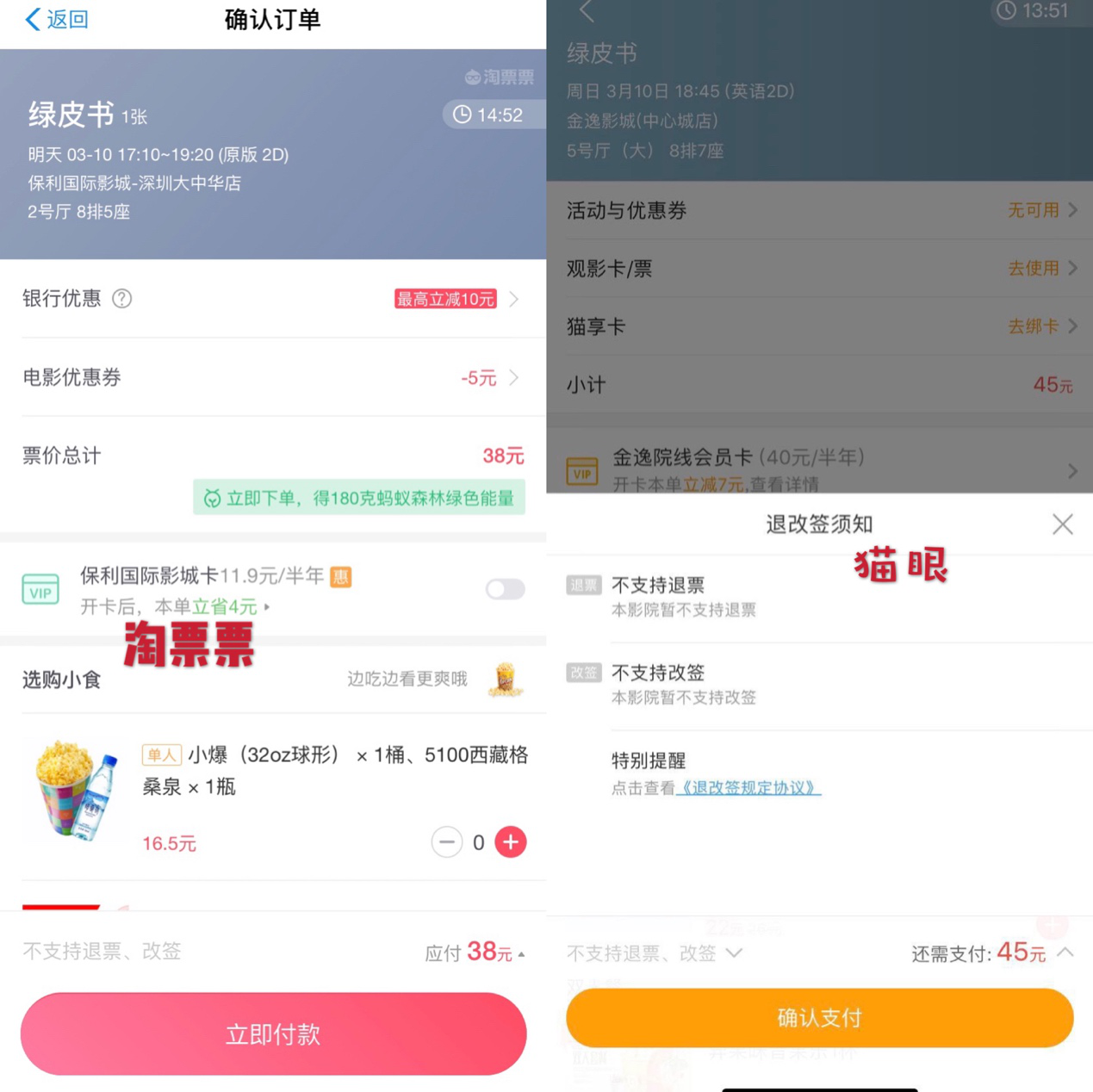 記者日前以熱映的電影《綠皮書》為例,在手機(jī)上查看福田各大影院“退改簽”情況。據(jù)統(tǒng)計(jì),貓眼APP上當(dāng)天的同一時(shí)段也有22家電影院可以購(gòu)票,其中有7家電影院不支持“退改簽”,4家電影院僅支持“改簽”,11家電影院支持“退改簽”;淘票票APP上當(dāng)天的同一時(shí)段共有22家電影院可以購(gòu)票,其中有10家電影院不支持“退改簽”,占比不到50%。