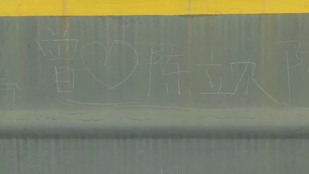 今天中午,記者來到現(xiàn)場,看見兩節(jié)火車的車廂上都有多處被不文明涂寫的痕跡。有些痕跡是用手指直接涂寫的,有些則是用尖利器物刻寫。內(nèi)容大都是刻上名字,表達(dá)愛意,到此一游,甚至是寫詩。