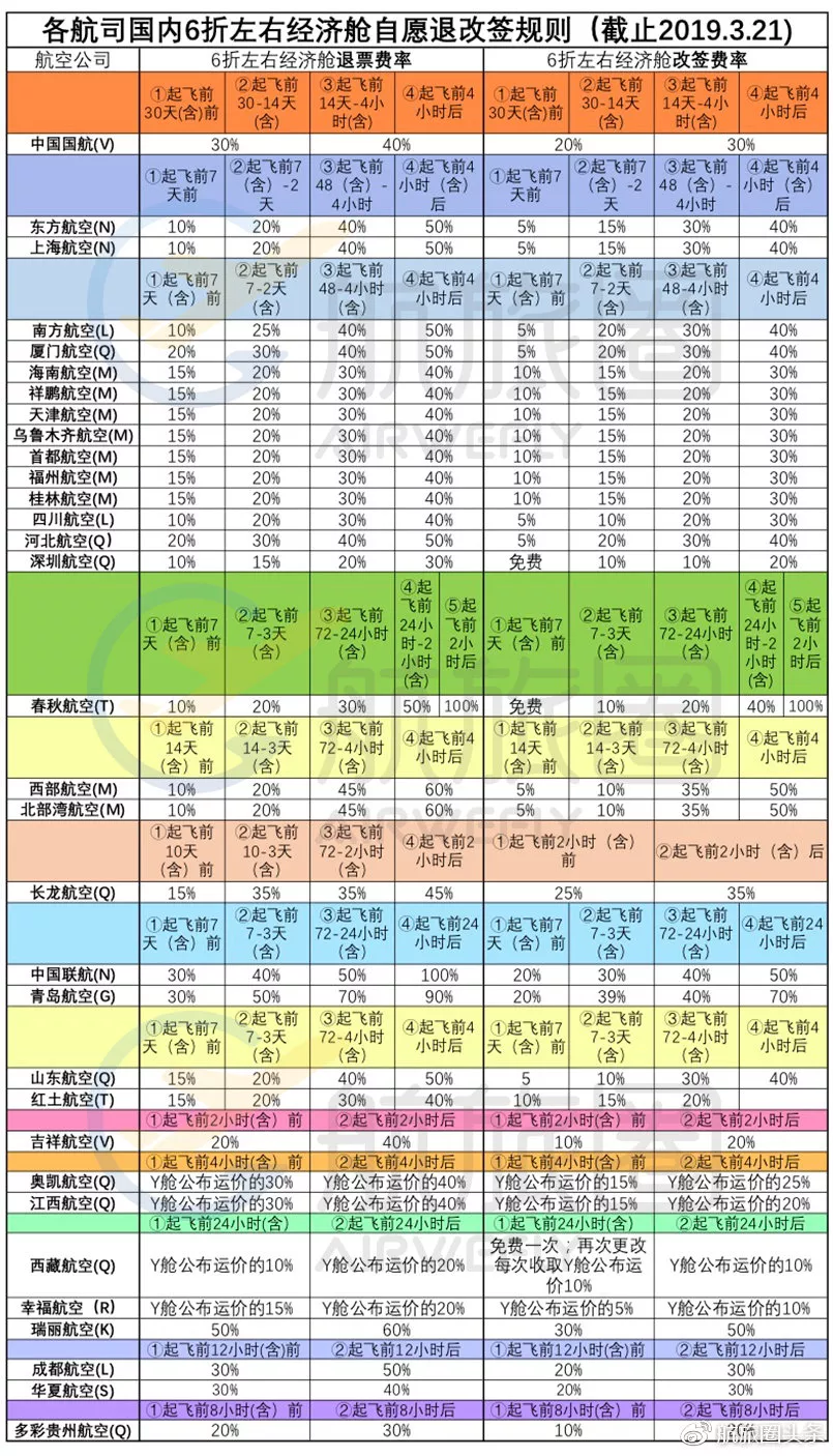 具體每家航司收取多少退改簽手續(xù)費(fèi),可以詳見(jiàn)下方表格↓↓↓