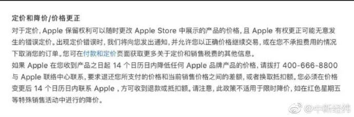 蘋果官方在公告中也指出,如果蘋果在用戶收到產(chǎn)品之日起的14個(gè)日歷日內(nèi)降低任何 Apple品牌的產(chǎn)品價(jià)格,用戶可要求退還差額。