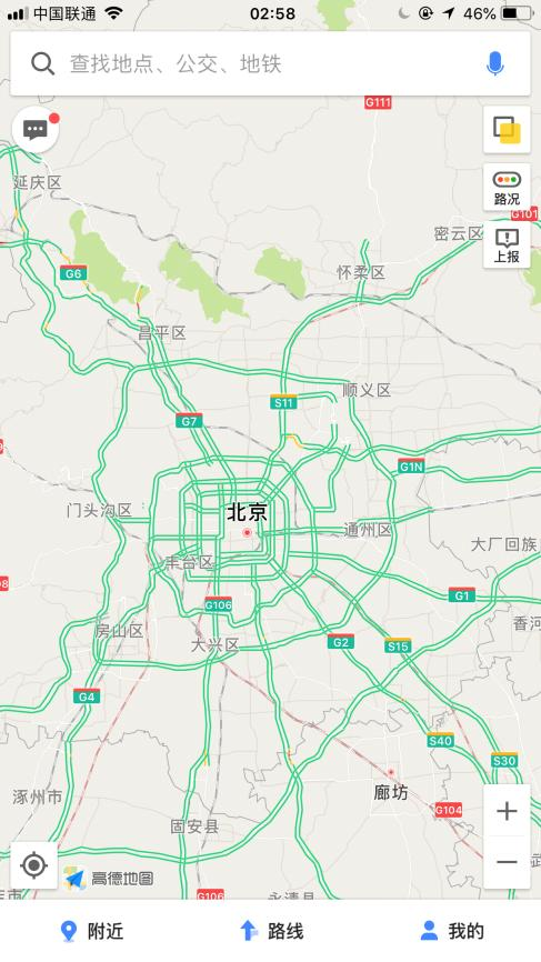 凌晨2點(diǎn)58分,北京周邊,高德地圖上看,一片綠色,讓人覺(jué)得特別舒服。