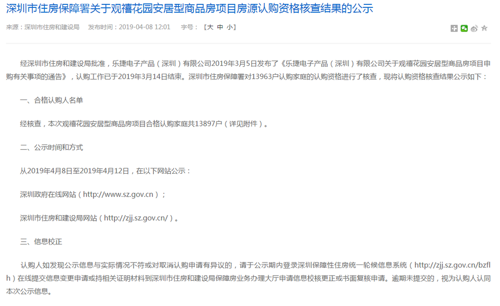 深圳新聞網(wǎng)2019年4月9日訊(記者 劉婷)記者從市住房保障署獲悉,觀禧花園安居型商品房項(xiàng)目認(rèn)購(gòu)工作已經(jīng)結(jié)束。經(jīng)核查,該項(xiàng)目合格認(rèn)購(gòu)家庭共13897戶(hù),合格家庭名單自4月8日至4月12日在深圳政府在線(xiàn)和深圳市住房(http://www.sz.gov.cn)和建設(shè)局(http://zjj.sz.gov.cn/)網(wǎng)站公示。