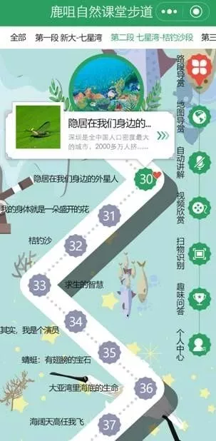隨著綠道行進(jìn)的深入,記者來到第一個自然觀察研習(xí)點(diǎn),這里配置有自然研習(xí)導(dǎo)賞標(biāo)識牌,牌上有植物動物的照片及介紹,牌子的角落有供游客學(xué)習(xí)的二維碼。記者了解到,新區(qū)同時(shí)開發(fā)建立一套APP自然課堂學(xué)習(xí)系統(tǒng),在綠道全程配套建設(shè)64個實(shí)地自然觀察研習(xí)點(diǎn),設(shè)置了260余個自然研習(xí)導(dǎo)賞標(biāo)識,接入專業(yè)智能識別軟件,配以體量龐大生物影像數(shù)據(jù)庫。掃碼進(jìn)入APP就可以通過文字、圖片和音像資料了解到“大鹿線”全景介紹和分區(qū)介紹,以及物種相關(guān)知識。同時(shí),該系統(tǒng)利用手機(jī)GPS定位技術(shù),為行進(jìn)中的市民游客自動講解所到之處的自然課堂語音課程。來自羅湖的資深驢友李先生告訴記者,來“大鹿線”徒步,不僅鍛煉身體愉悅心情,還可以學(xué)到豐富的自然知識,打開APP行走全程,猶如參觀了一座多維一體的山?!叭安┪镳^”。