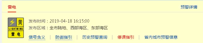 深圳市氣象臺(tái)于2019年04月18日16時(shí)15分在全市發(fā)布雷電預(yù)警,預(yù)計(jì)30-60分鐘內(nèi)全市將逐漸自西向東轉(zhuǎn)雷陣雨,按照防御預(yù)案停止戶外易燃易爆危險(xiǎn)作業(yè),并加強(qiáng)危化場(chǎng)所安全管理,正值下班放學(xué)高峰期,請(qǐng)注意防御。